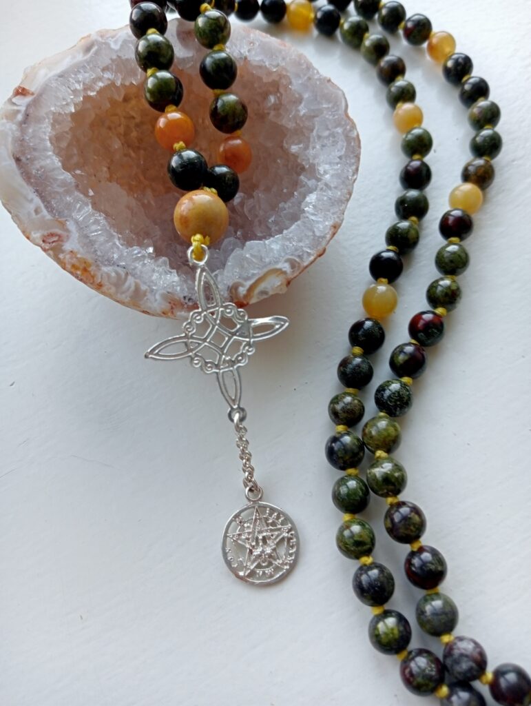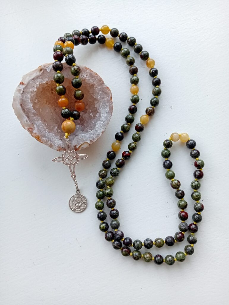 Deze mala is gemaakt van dragon blood jaspis met details van gele jade. Ze draagt een crazy lace agaat guru-kraal en is afgewerkt met een echt zilveren heksenknoop.