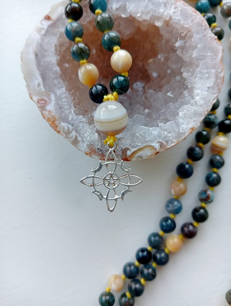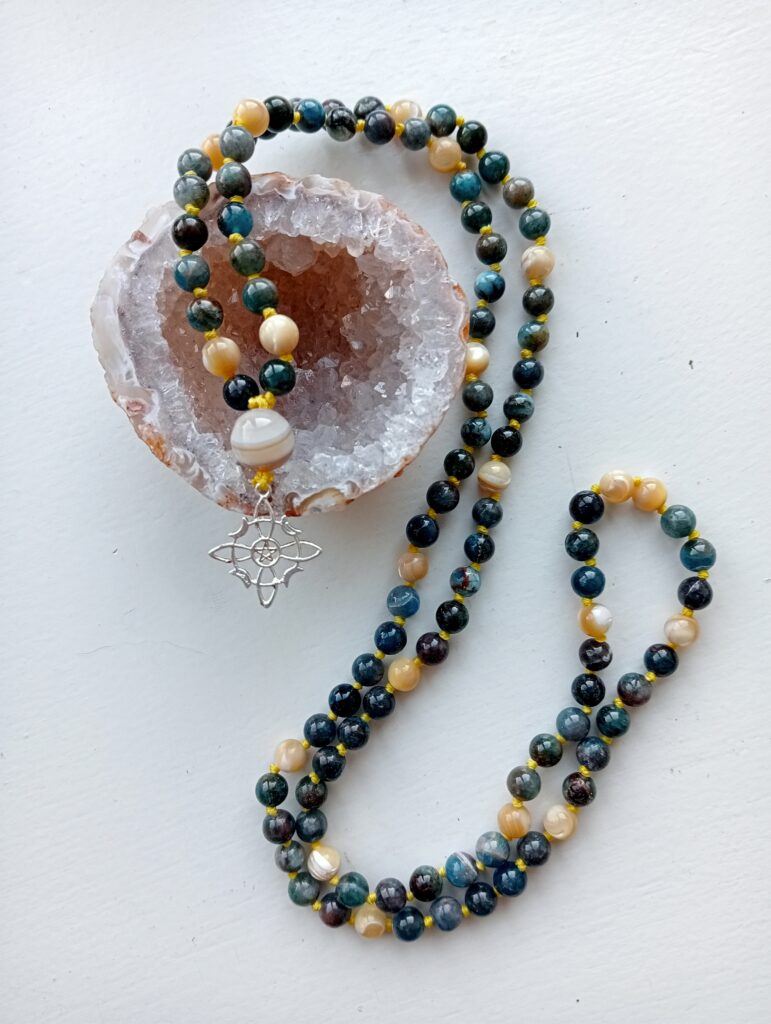 Deze mala is gemaakt van apatiet met details van schelp. Ze draagt een agaat guru-kraal en is afgewerkt met een echt zilveren heksenknoop.