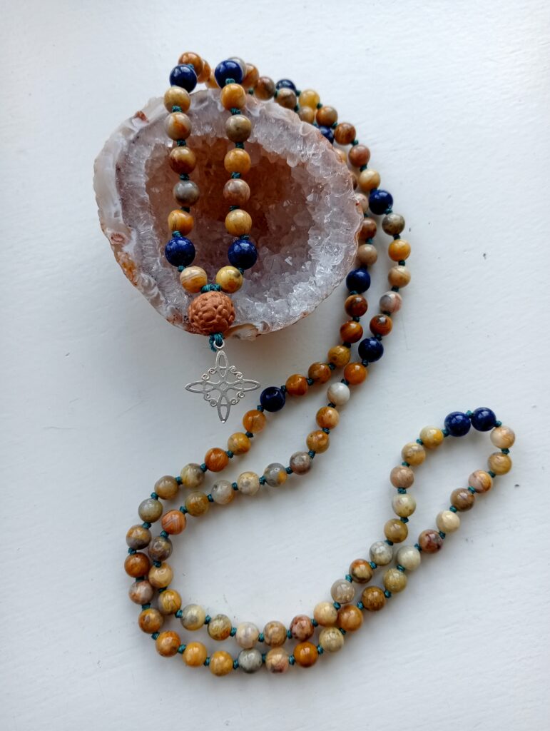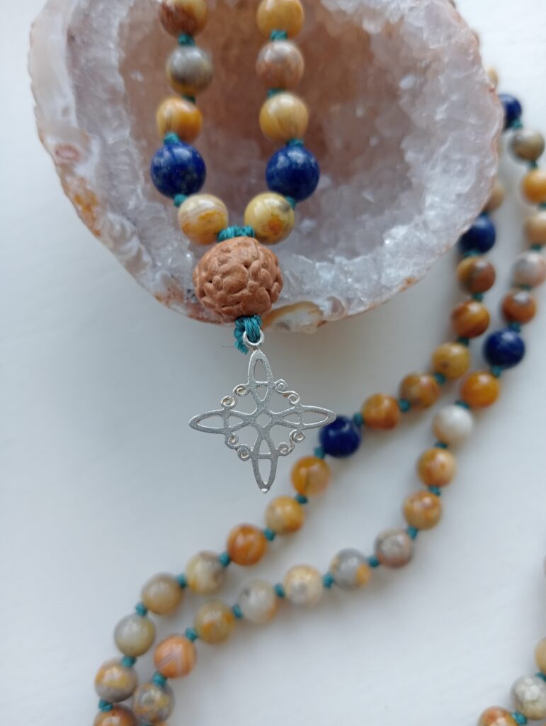 Deze mala is gemaakt van crazy lace agaat met details van lapis lazuli. Ze draagt een rudraksha guru-kraal en is afgewerkt met een echt zilveren heksenknoop.