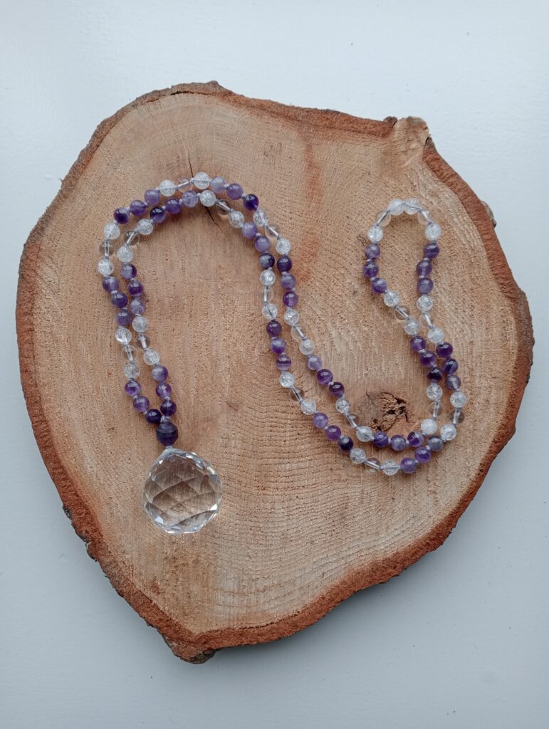 Deze mala is gemaakt van amethist, bergkristal and crackled bergkristal. Ze draagt een amethist als guru-kraal, en is afgewerkt met een prisma als hanger.