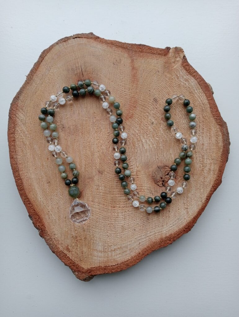 Deze mala is gemaakt van groene jaspis met kwarts, bergkristal and crackled bergkristal. Ze draagt een aventurijn als guru-kraal, en is afgewerkt met een prisma als hanger.
