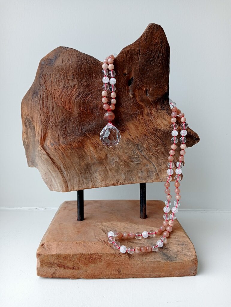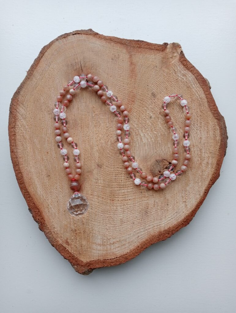 Deze mala is gemaakt van maansteen, bergkristal and crackled bergkristal. Ze draagt een agaat als guru-kraal, en is afgewerkt met een prisma als hanger.