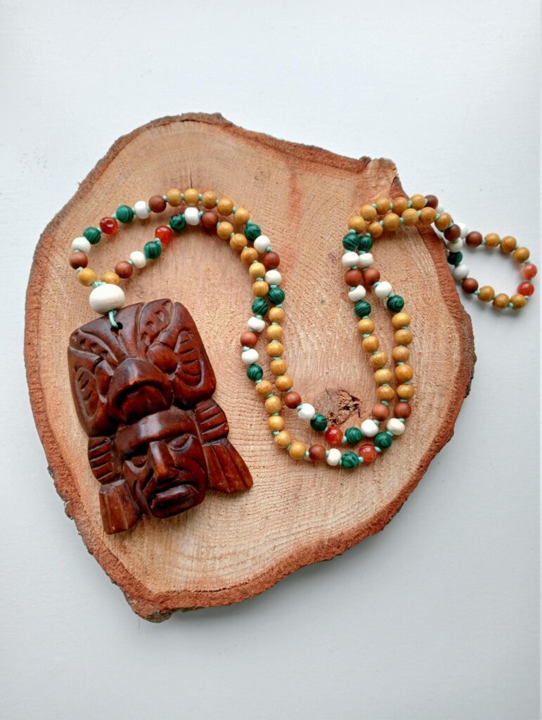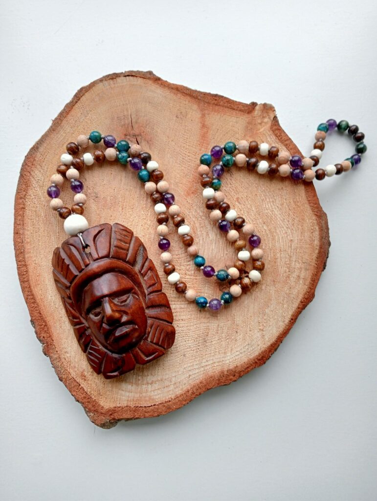 Deze mala is gemaakt van houten kralen met details van been, amethist en gekleurde tijgeroog. Hij draagt een guru-kraal van been en is afgewerkt met een houten masker.