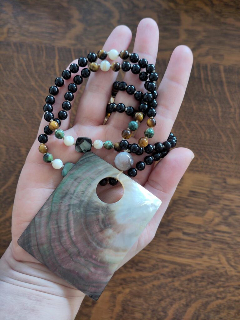 Ze is gemaakt van onyx kralen met details van tijgeroog, Afrikaanse turquoise en schelp. Ze draagt aan twee zijdes een gefacetteerde abalone kraal om de kwarten van de mala te markeren. Ze heeft een agaat kraal als guru-kraal en is afgewerkt met een grote schelp als hanger.