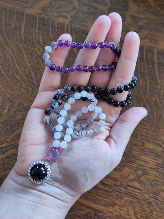 Deze mala is gemaakt van toermalijn kwarts, onyx en amethist. Ze draagt een amethist als guru-kraal en is afgewerkt met een antiek zilveren hangertje (835 zilver) met onyx steentje.