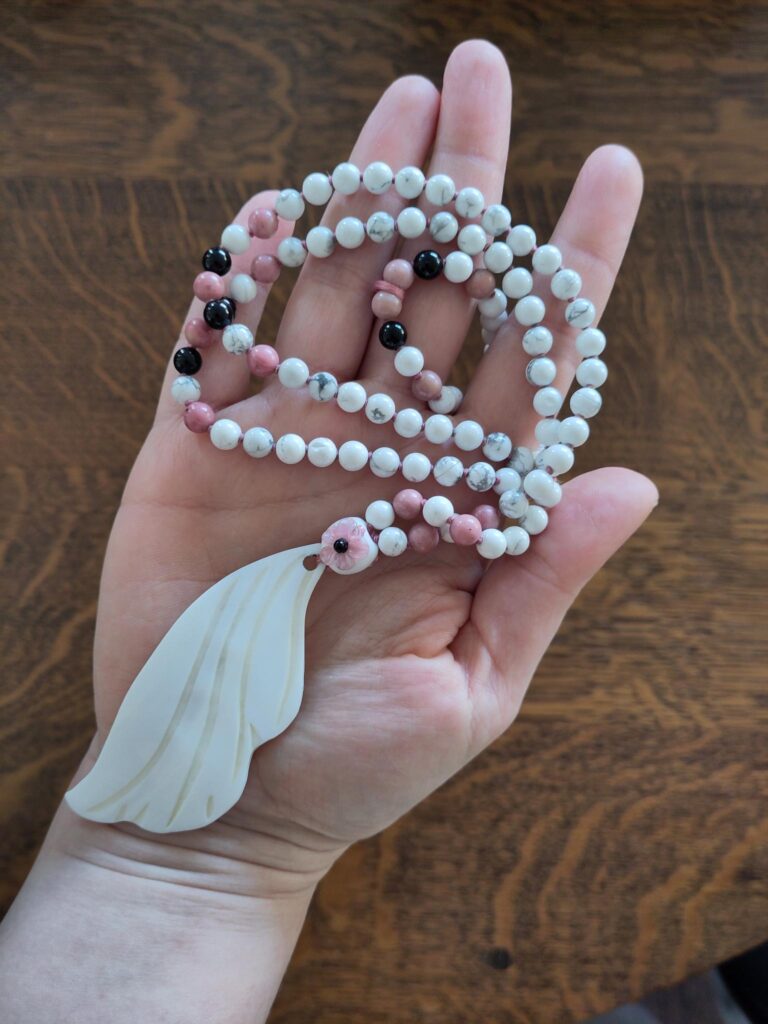 Deze mala is gemaakt van howliet kralen met details van rhodoniet en onyx. Ze draagt een glazen guru-kraal en is afgewerkt met een vleugel gemaakt van schelp.