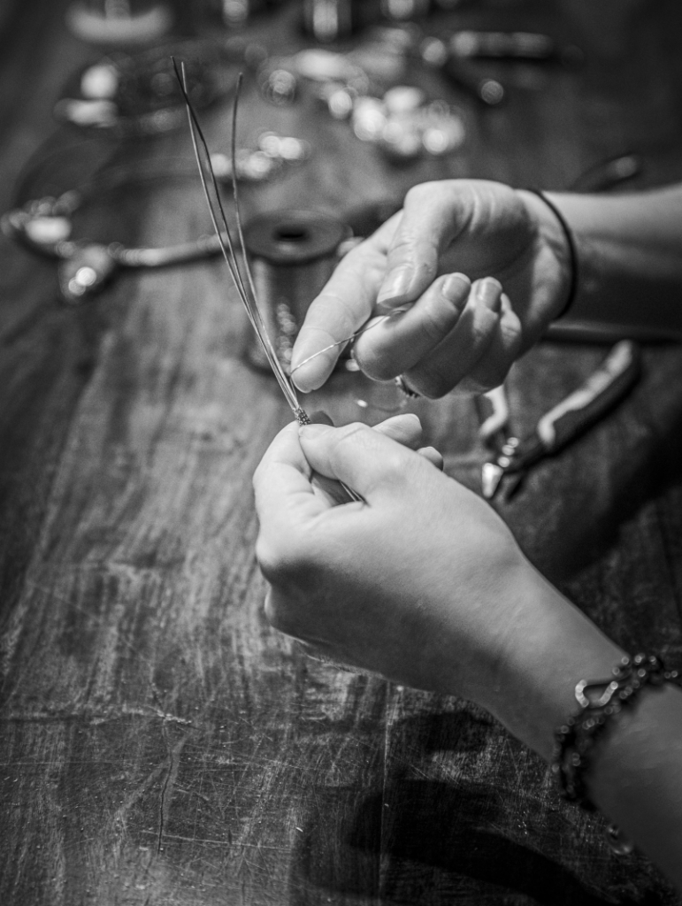 Als je de hangers ziet, en je hebt ze in je hand, dan voel je diep ontzag voor het draad. Daarom zijn de mala’s met deze kleine kunstwerkjes ook gemaakt met het draad centraal. Het draad in haar veelzijdigheid; als verbinder, als vangnet, als eeuwig doorgaande stroom. Het draad die de stenen laat oplichten, het draad die de stenen op hun best laat zijn, zoals het net van licht wat ons allemaal verbindt hetzelfde doet. Haar hangers werden de basis voor de serie “Draadkracht”.