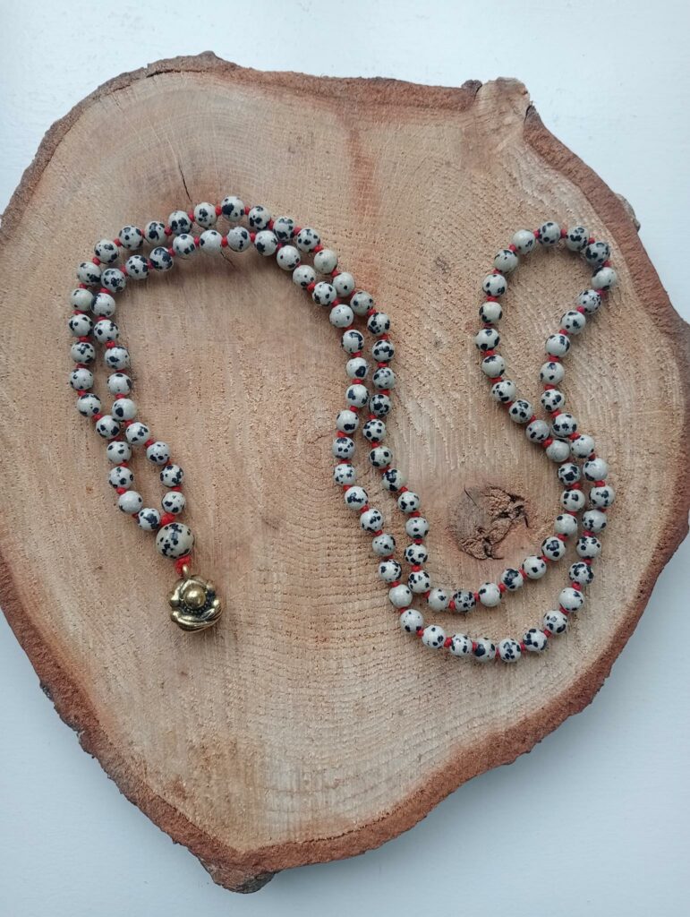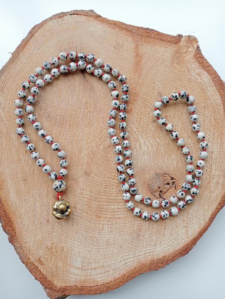 Deze mala is gemaakt van dalmatier jaspis. Ze draagt een dalmatier jaspis guru-kraal en is afgewerkt met een messing Orang Malu hanger.