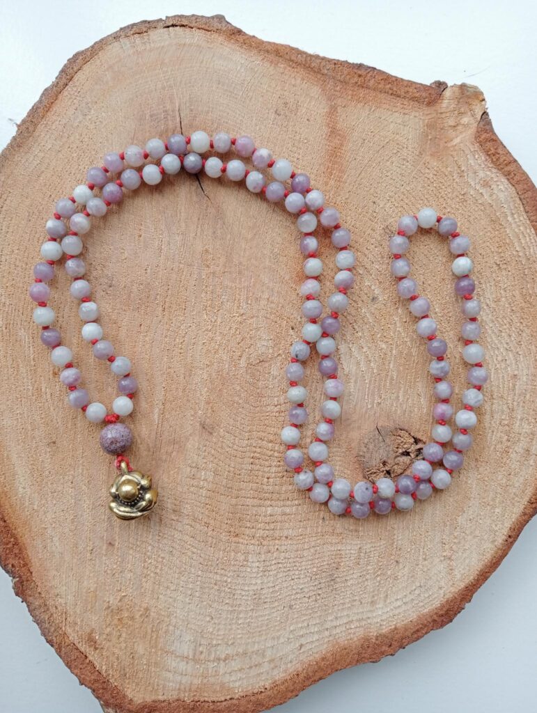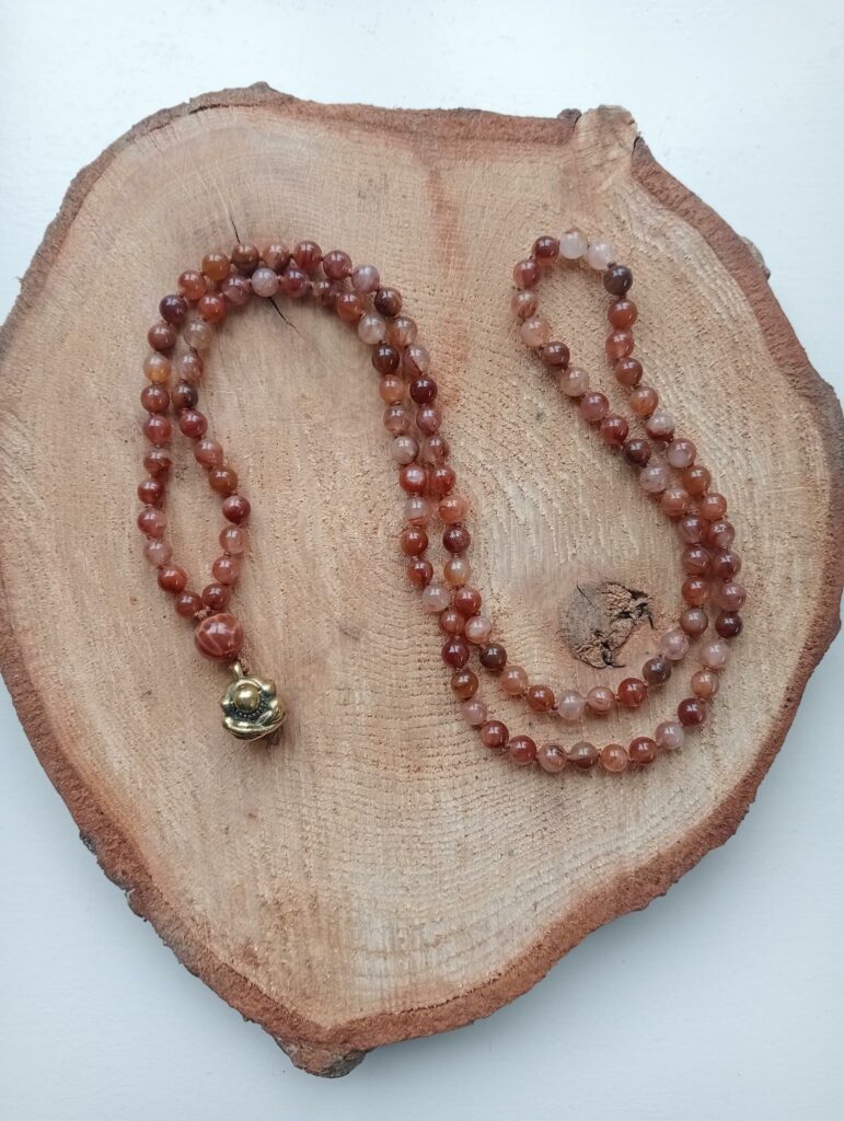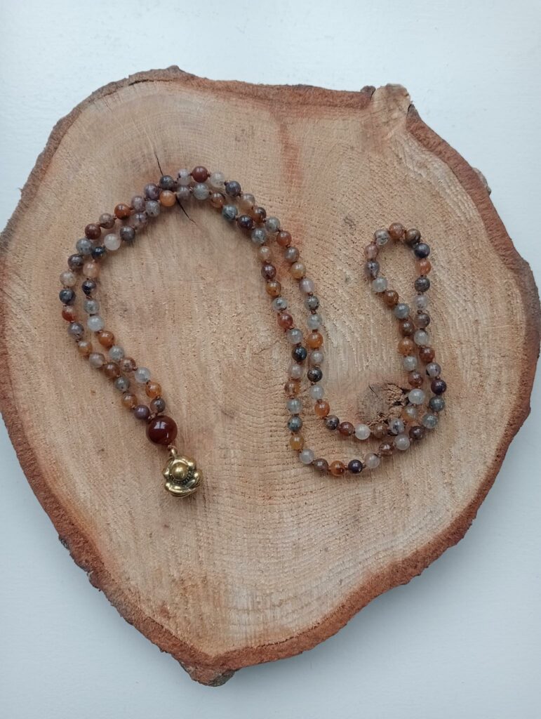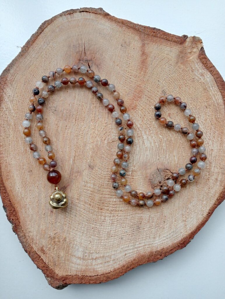 Deze mala is gemaakt van lodoliet. Ze draagt een agaat guru-kraal en is afgewerkt met een messing Orang Malu hanger.