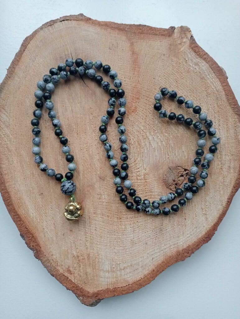 Deze mala is gemaakt van sneeuwvlok obsidiaan. Ze draagt een sneeuwvlok obsidiaan guru-kraal en is afgewerkt met een messing Orang Malu hanger.
