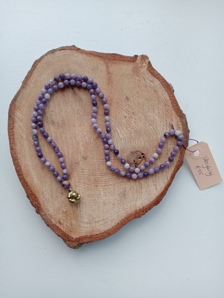 Deze mala is gemaakt van lepidoliet en draagt een lepidoliet als guru-kraal. Ze heeft een messing Orang Malu als hanger.