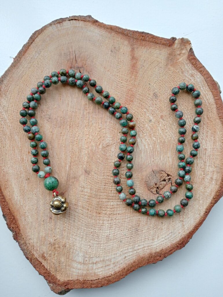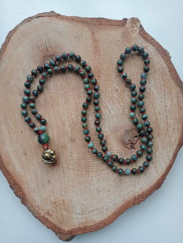 Deze mala is gemaakt van afrikaanse turquoise. Ze draagt een robijn in zoisiet guru-kraal en is afgewerkt met een messing Orang Malu hanger.
