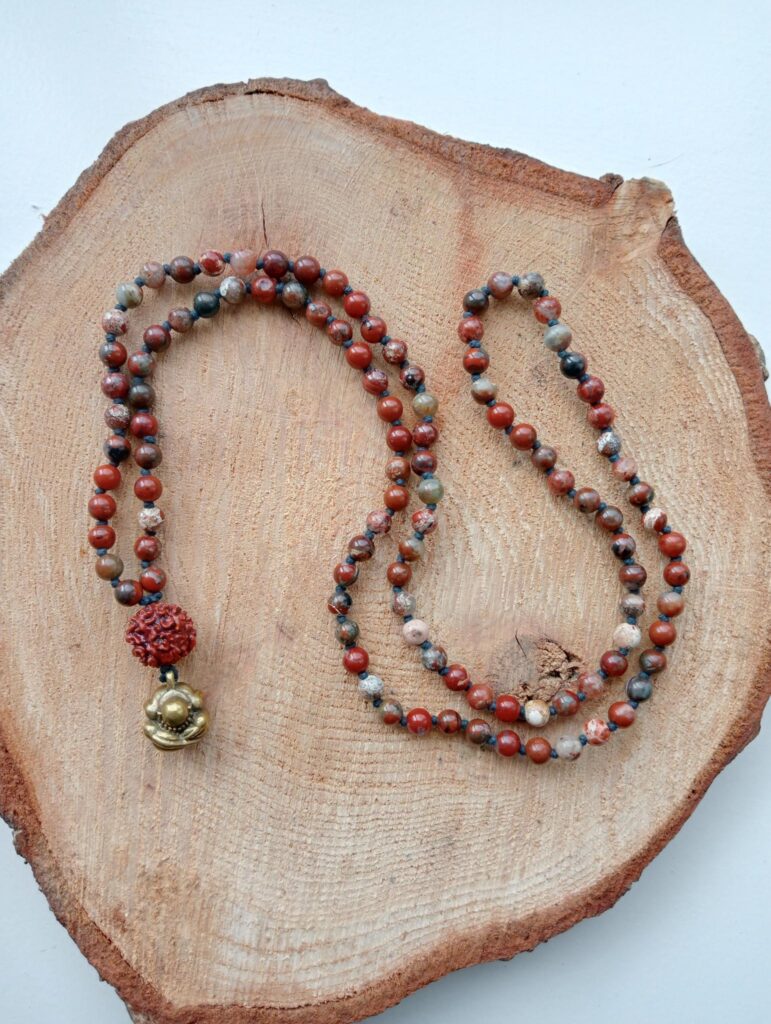 Deze mala is gemaakt van brecci jaspis. Ze draagt een rudraksha guru-kraal en is afgewerkt met een messing Orang Malu hanger.