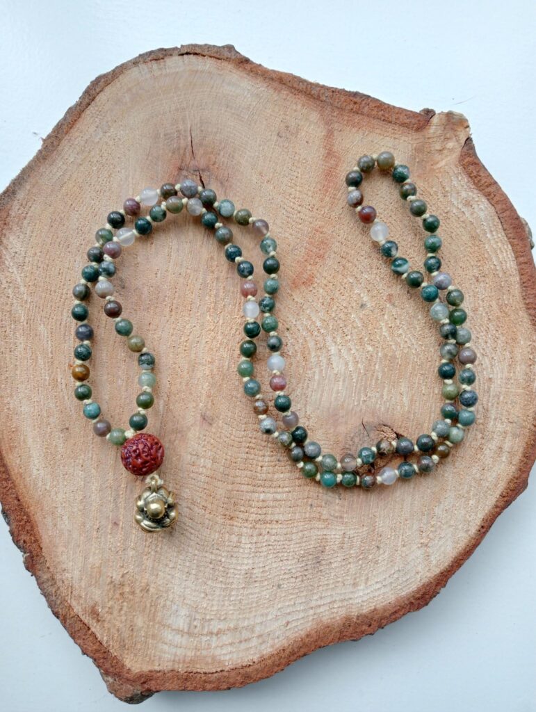 Deze mala is gemaakt van groene agaat. Ze draagt een rudraksha guru-kraal en is afgewerkt met een messing Orang Malu hanger.