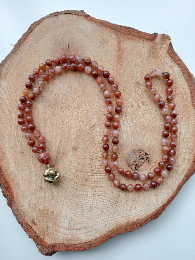 Deze mala is gemaakt van ruby calciet. Ze draagt een ruby calciet guru-kraal en is afgewerkt met een messing Orang Malu hanger.