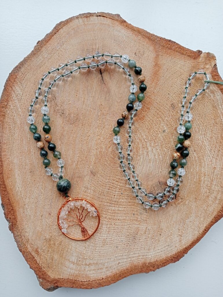 Ze is gemaakt van bergkristal en heeft details van crackled bergkristal, mosagaat en landschapsjaspis. Ze heeft een mosagaat hanger als guru-kraal en is afgewerkt met een koperen levensboomhanger met bergkristal details.