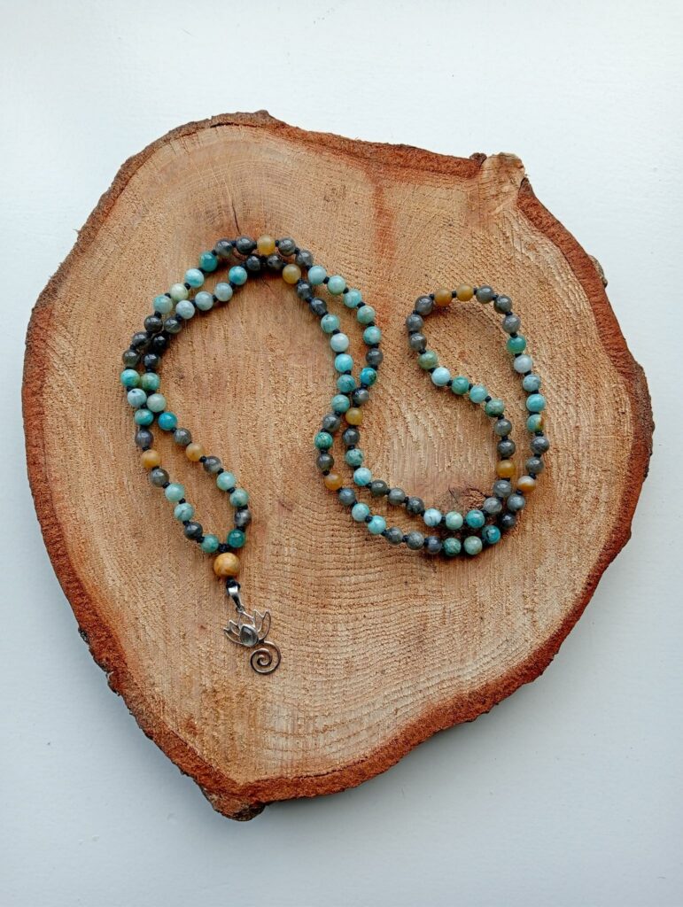 Deze mala is gemaakt van amazoniet met labradoriet en heeft details van gele jade. Ze draagt een crazy lace agaat als guru en is afgewerkt met een echt zilveren (925) hanger van een lotus met een labradoriet steentje.