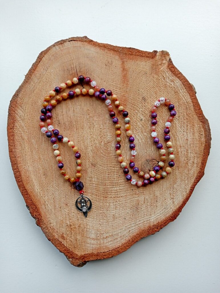 Deze mala is gemaakt van crazy lace agaat, paarse agaat en heeft details van crackled bergkristal en maansteen. Ze heeft een amethist als guru-kraal en is afgewerkt met een echt zilveren (925) hanger van een maangodin met pentagram.