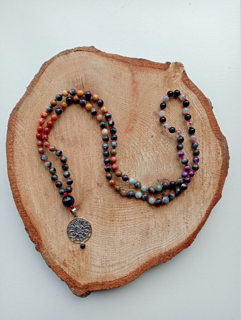 Deze mala is gemaakt van lavrikiet met details van carneool, crazy lace agaat, unakiet, amazoniet, amethist, toermalijn kwarts en onyx. Ze heeft een amethist als guru-kraal en is afgewerkt met een echt zilveren (925) hanger met een lotus met bija-mantra’s en een amethist detail.
