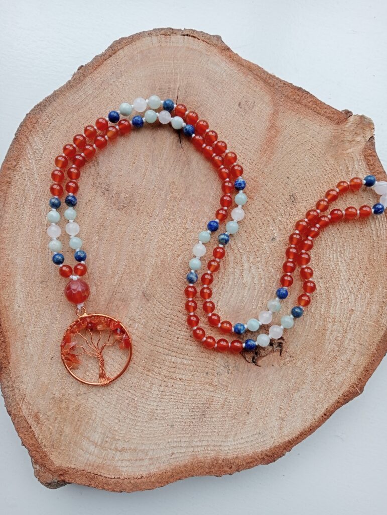 Deze mala is gemaakt van carneool kralen, met details van lapis lazuli, amazoniet en rozenkwarts. Ze heeft een carneool als guru kraal, en is afgewerkt met een koperen levensboomhanger met carneool details.
