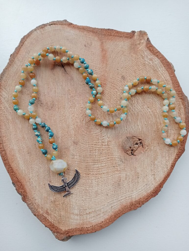 Ze is gemaakt van gele jade met details van gekleurde jaspis. Ze draagt een asymmetrische golden healer guru-kraal en is afgewerkt met een echt zilveren Isis-hanger.